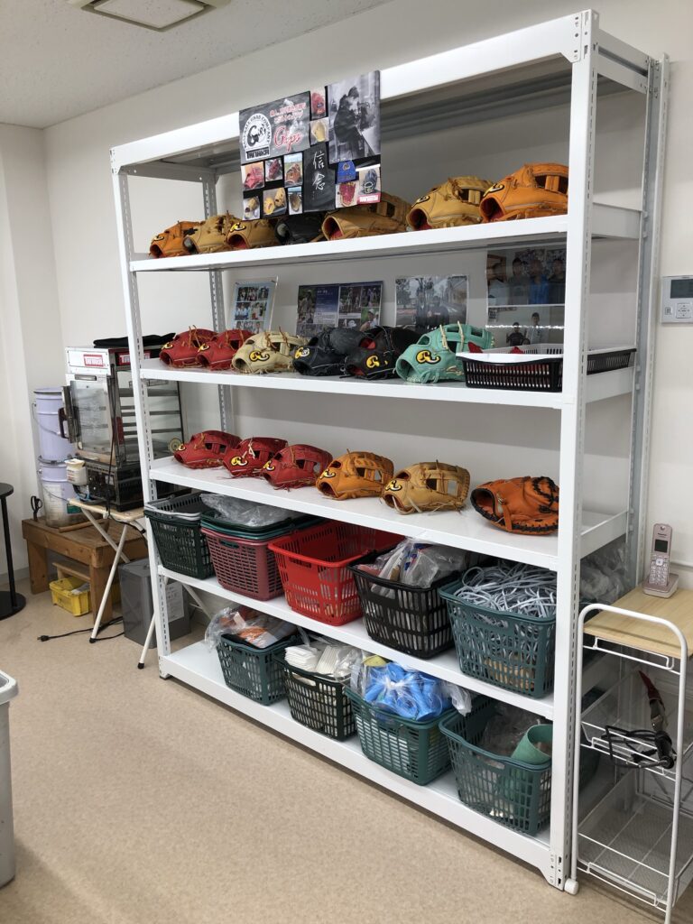 作業場所の棚には若き天才グラブ職人”田中勇也”が魂を込めて作り上げた作品が1部飾られています! 私としては...